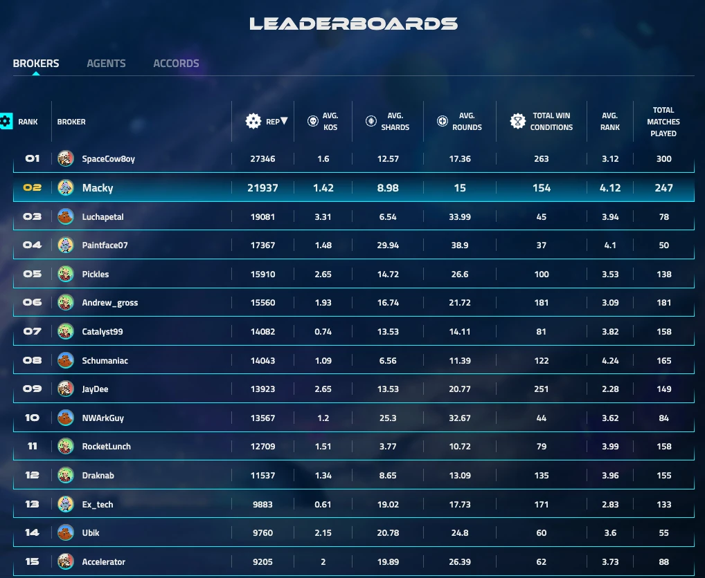 One of the things we’re most excited about featuring is the new leaderboards page. Sortable in innumerable ways and covering everything from Broker stats (all matches played by an individual Broker) to Accord stats, and even to detailed breakdowns on individual Agents, the leaderboard can be both the home for tracking how you stack up against the other Brokers and a valuable resource when it comes to quickly determining some of the aspects of Agents you’re matched up against in a specific match.